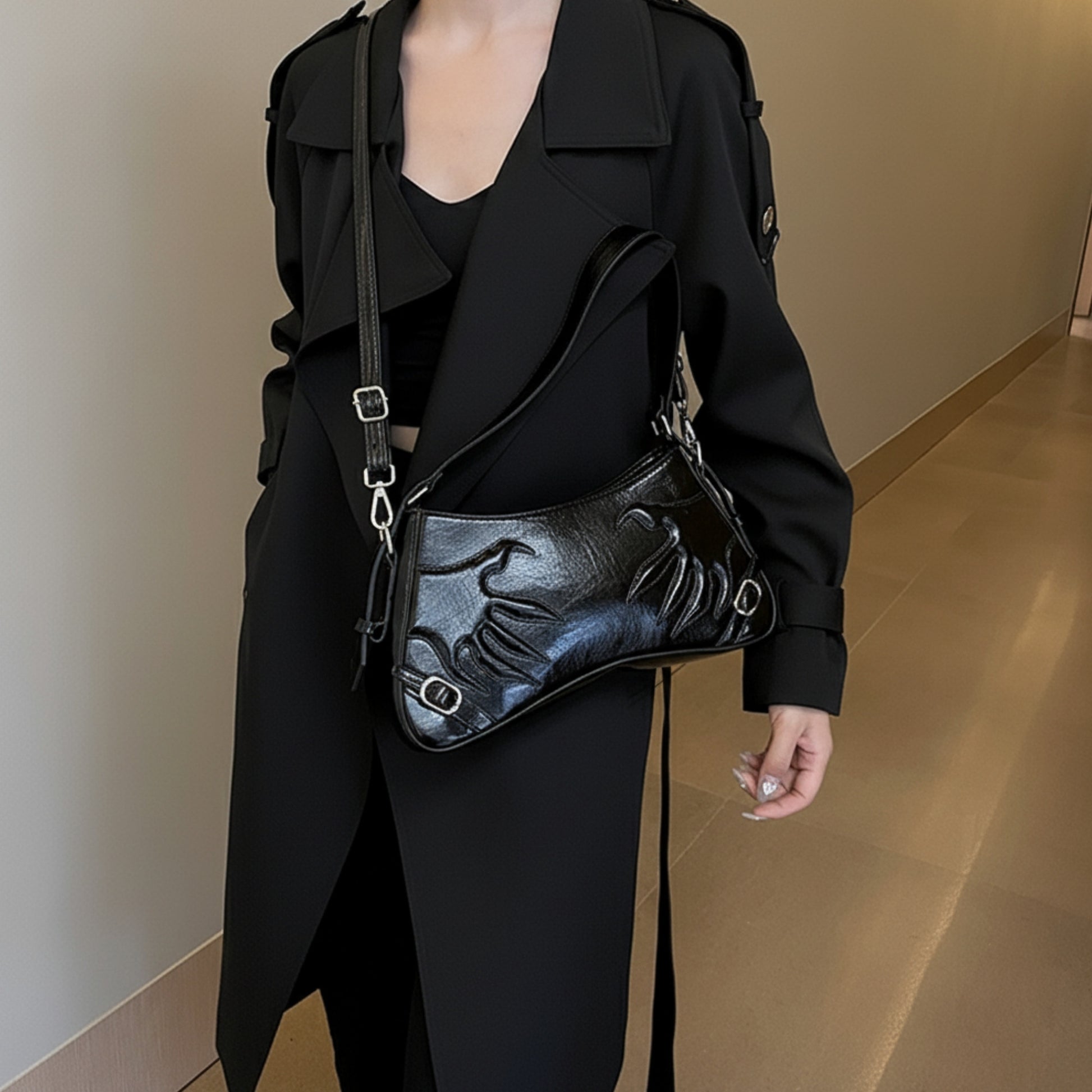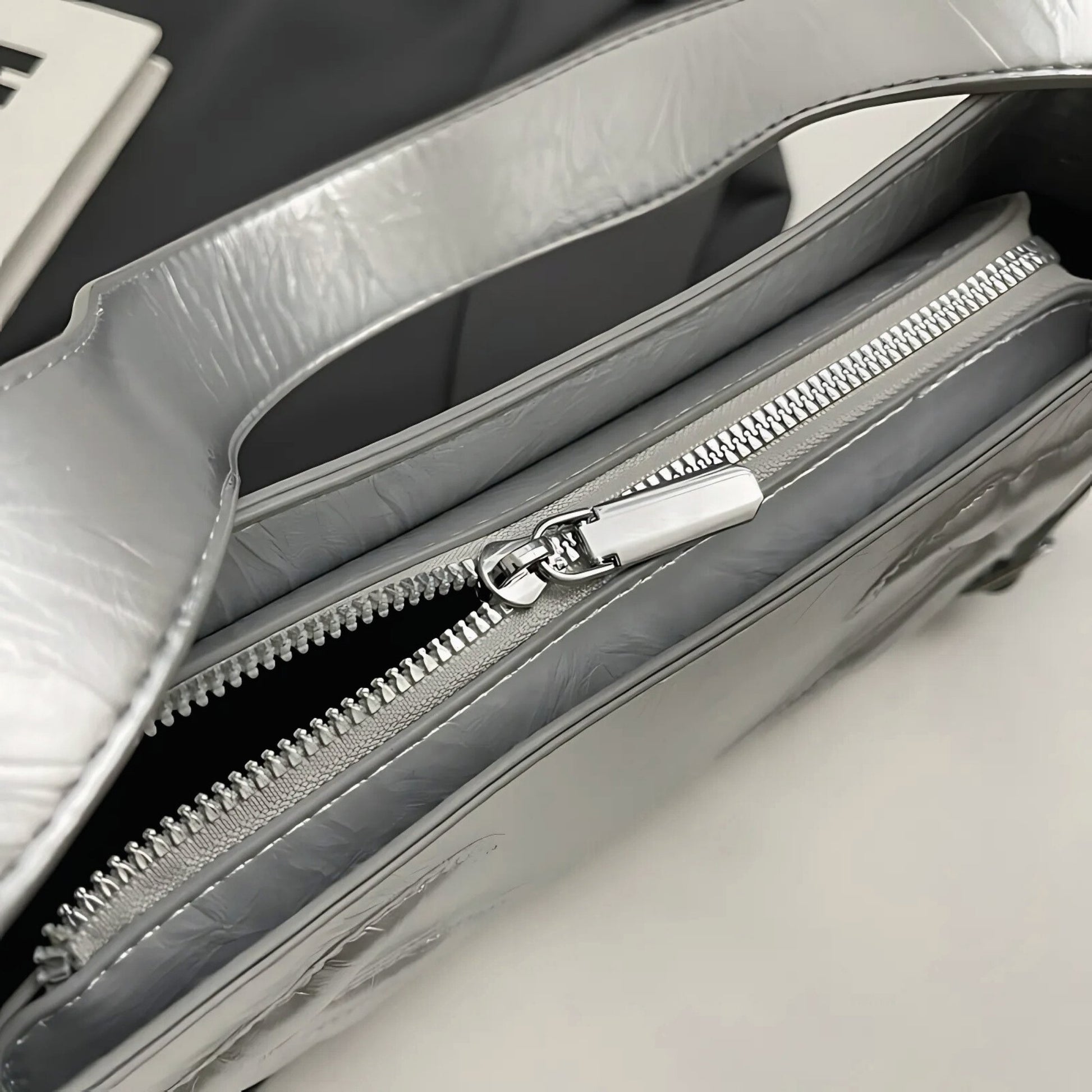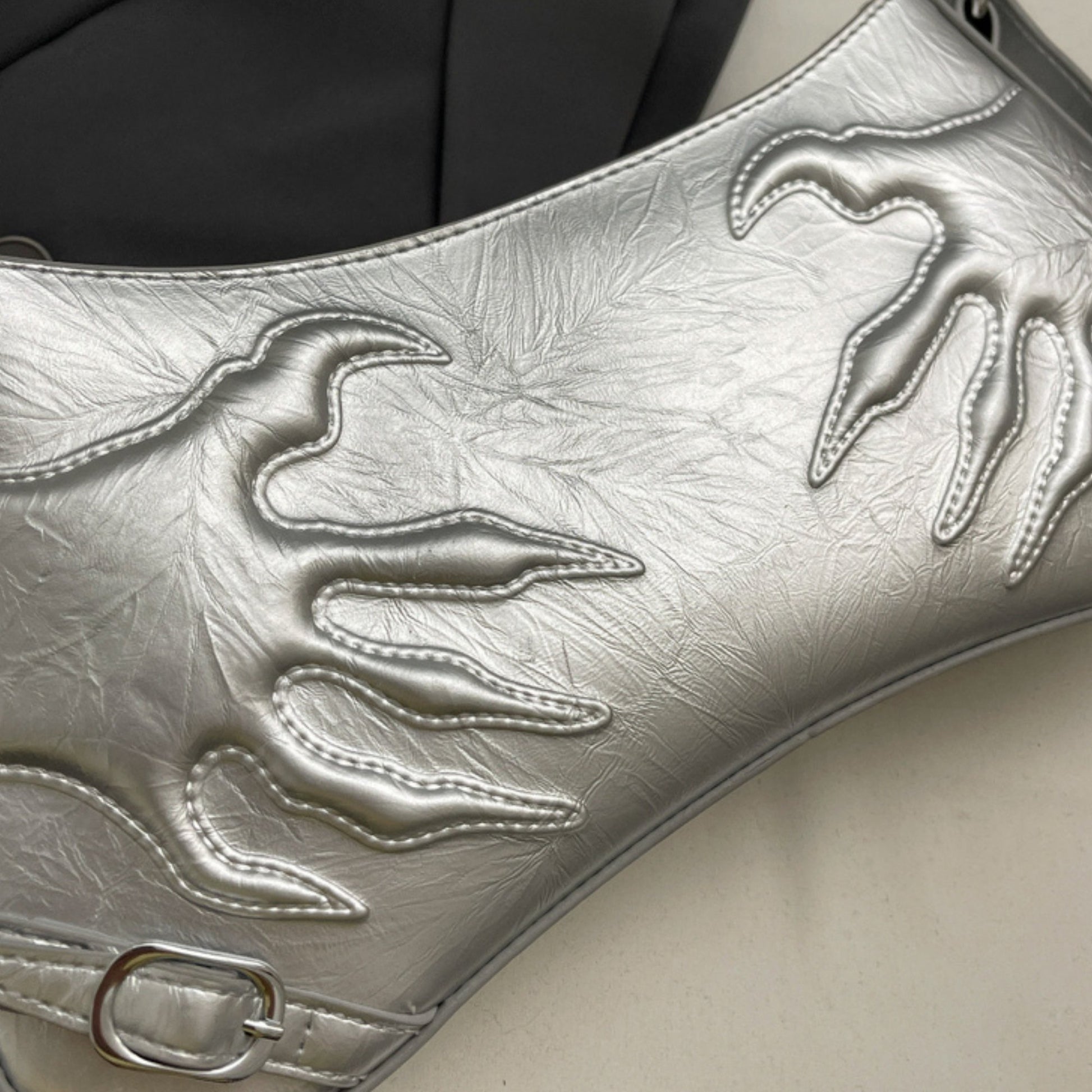 Color Note: Silver is cool-luminous; Bronze brings warm chrome glow; Black reads satin-matte with high contrast hardware. Shine localizes along stitch channels and embossed contours.
