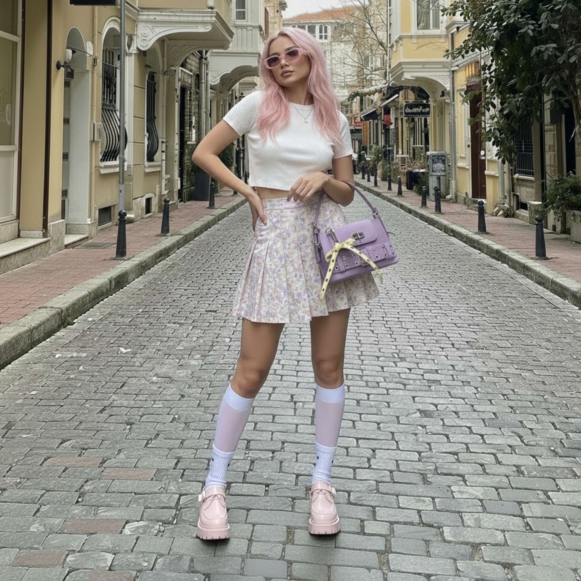- Lavender variant: lemon yellow accessory (bow harmony) + washed grey denim